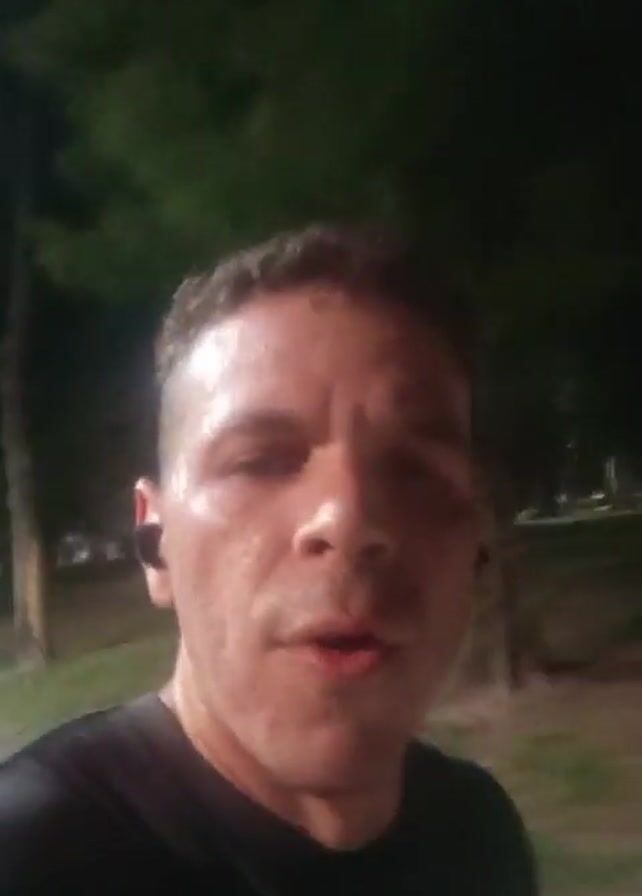 The video features a man who is perspiring while running outside at night. He wears a black t-shirt and has short, dark hair. The lighting is low, but streetlights are visible in the background, along with trees. The man is facing the camera and speaking as he runs, his breath visible in the dim light. He appears to be wearing an earpiece in his left ear.