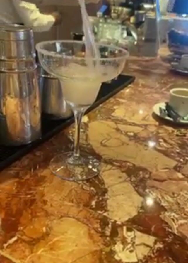 A bartender prepares a drink. They are seen pouring a translucent liquid from a silver metal cocktail shaker into a stemmed glass, the rim of which is covered in a white substance. The counter is made of marble, brown and tan in color, with reflective areas. Next to the shaker is a black tray. In the background is an espresso machine, multiple cups and saucers, and additional unidentified items. The bartender is wearing a white, collared shirt. A little sound is audible in the background.