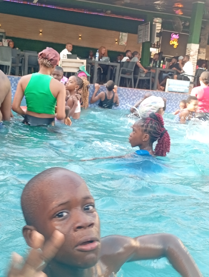 People swim in a pool. A child is in the foreground, making a peace sign. Several other people are visible in the pool, including children and adults. Behind the pool is a restaurant or bar area where people are sitting at tables. The scene is casual and appears to be at a leisure facility.