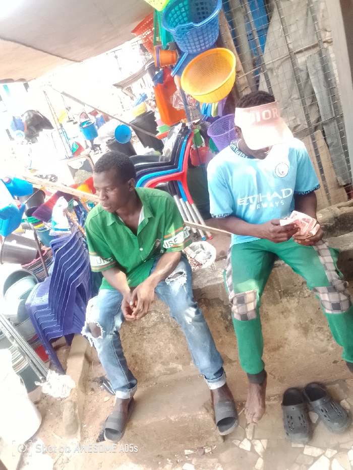 A daylight image depicts two adult males seated on a concrete surface within an outdoor market environment in Awka, Nigeria