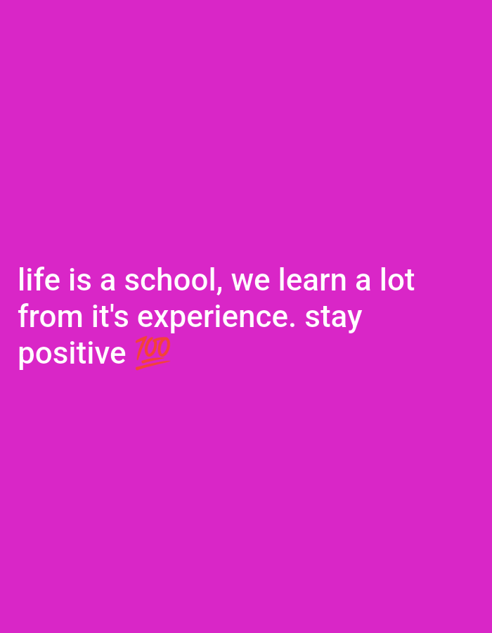 The image displays white text on a solid magenta-pink background. The text, centrally aligned towards the upper-left, reads: "life is a school, we learn a lot from it's experience. stay positive 💯". A red and yellow "💯" emoji is positioned after the word "positive." No people, discernible objects, actions, or physical environment are depicted. The scene is a digital graphic; therefore, no specific location in the city of Unknown, Unknown, or any other city, is present or discernible.