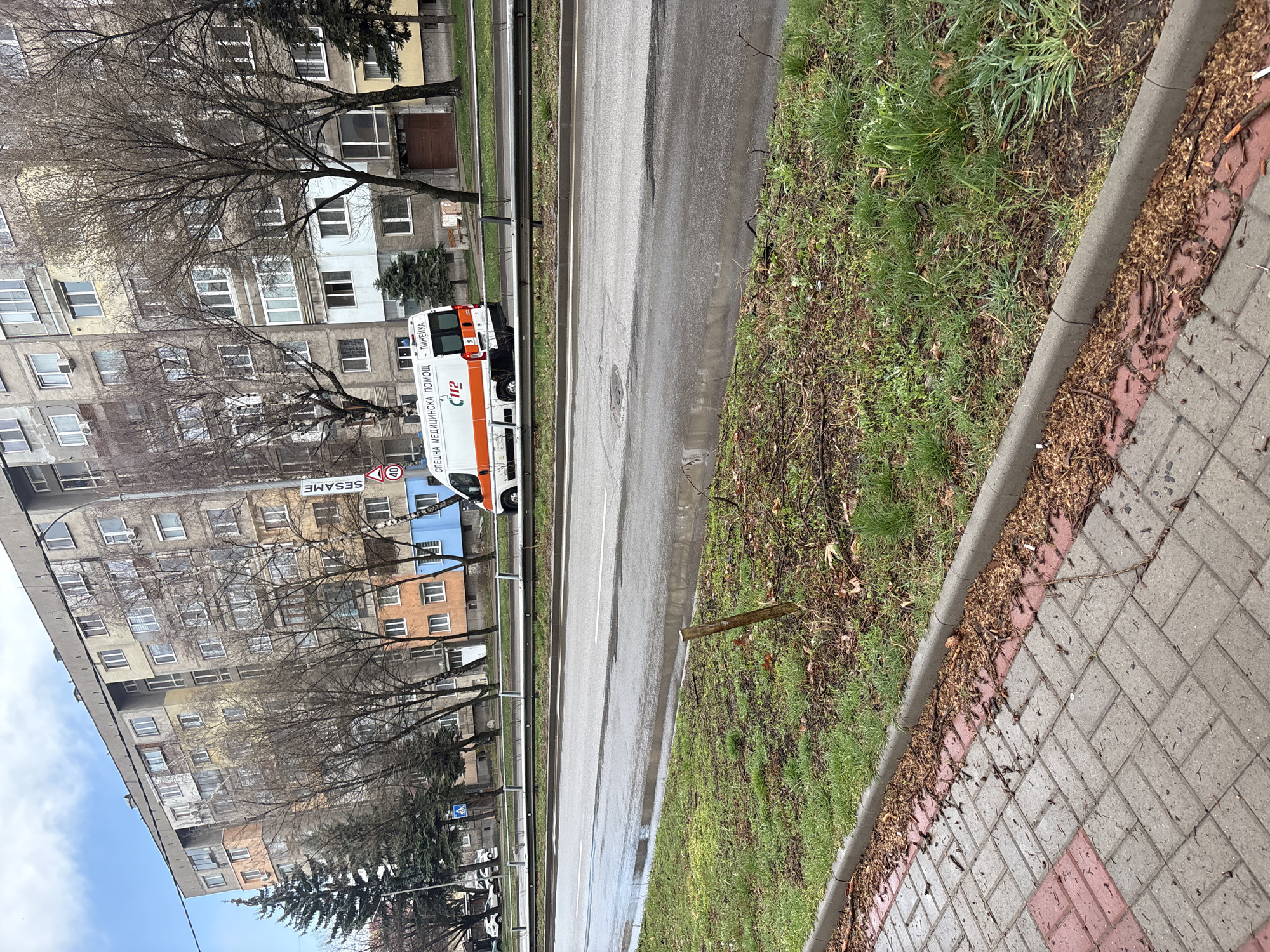 This image depicts an urban street scene on a wet, overcast day in Pernik, Bulgaria, likely on a major boulevard such as bul. Yuri Gagarin. The foreground features a wet, paved sidewalk constructed from interlocking grey and reddish-brown pavers, separated by a concrete curb from a grassy median. This median contains patches of green grass, exposed soil, scattered leaf litter, small branches, and puddles of standing water. A single wooden stake protrudes from the ground in the median. The midground shows a multi-lane asphalt road, visibly wet and reflecting light, indicating recent rainfall. A metal barrier or guardrail runs parallel to the road, separating it from the opposite side. An ambulance, white with prominent orange stripes and Bulgarian text "СПЕШНА МЕДИЦИНСКА ПОМОЩ - ЛИНЕЙКА" (Emergency Medical Aid - Ambulance) and the emergency number "С112" (112), is visible on the far side of the road, facing away from the viewer. The vehicle appears to be a Peugeot Boxer or similar model. Several bare deciduous trees and a few evergreen conifers line the streets on both sides. A speed limit sign displaying "40" km/h and a vertical "SESAME" sign are visible near the ambulance. The background is dominated by a large, multi-story residential building, characteristic of post-socialist bloc architecture. Its facade features various muted colors, including grey, beige, orange, and light blue sections. Numerous windows with white frames are visible across its many floors, some equipped with external air conditioning units. The sky overhead is partly cloudy, with areas of clear blue visible. No individuals are explicitly visible.