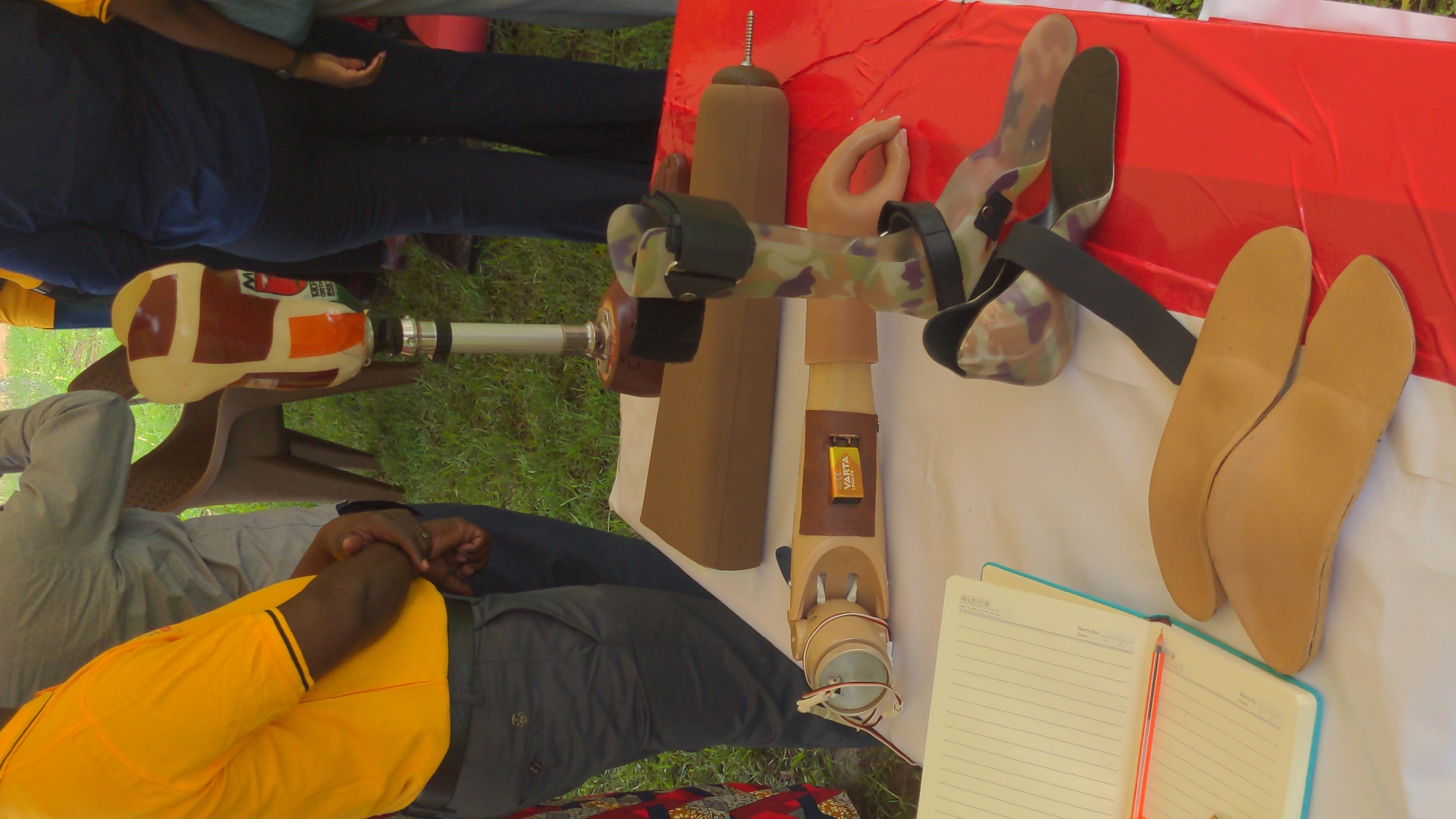 The image depicts an outdoor display of prosthetic and orthotic devices in Moshi, Tanzania. In the immediate foreground, an open notebook with blank pages and a red pen rests on a white tablecloth, alongside two tan-colored, anatomically shaped shoe insoles. To their right, a light brown forearm prosthesis featuring a visible yellow "VARTA" battery and a mechanical hand component is centrally positioned on the tablecloth. Adjacent to this, partially on a red plastic sheet covering the table's right side, lies a camouflage-patterned ankle-foot orthosis with straps and buckles. A light-colored mannequin hand is visible near the orthosis. Behind these items, a brown, cylindrical prosthetic calf component with a threaded bolt at one end is horizontally placed. Further back, a transfemoral prosthetic leg socket, cream-colored with irregular reddish-brown and orange-brown patches and a visible logo fragment, stands upright on a silver-colored post. Several individuals are present: A person wearing a yellow short-sleeved polo shirt with dark trim and dark gray trousers stands in the left foreground, their hands clasped. Behind them, a person in a light gray long-sleeved shirt and dark blue trousers is partially visible. To the right, another individual in a dark blue top and dark blue trousers is partially visible. A brown plastic chair is situated behind the table. The ground surface behind the display is covered with green grass.
