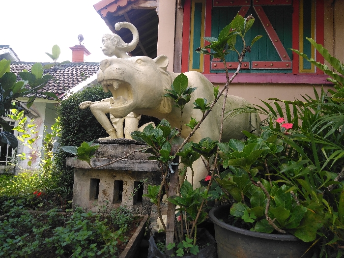 This image depicts an outdoor garden scene in Tilburg, Netherlands, with no people visible. A prominent, light-colored statue, likely concrete or stone, occupies the midground. It portrays a roaring, crouching feline-like creature with its mouth agape, upon whose back sits a smaller figure resembling a monkey with a proboscis. This statue rests on a multi-tiered concrete pedestal featuring three rectangular apertures on its visible face. The foreground contains various green foliage, including broad-leafed plants in a black pot on the right and smaller groundcover plants. Scattered red blossoms are visible among the vegetation. In the background, to the left, a portion of a house with a terracotta-tiled roof and white walls is partially obscured by a dense green hedge. To the right, a building section with a light ochre wall displays a closed window with bi-fold shutters. These shutters are green with red borders and accented with stud-like elements forming diagonal patterns. A reddish-brown roof eave is visible above the window.