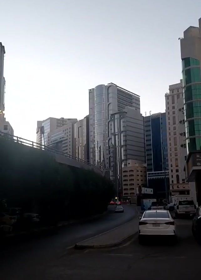 street scene in a city with tall buildings. The camera is positioned at street level, looking uphill. A white Toyota car is in the foreground, stopped on the right side of the road. Other cars and a small white truck pass by. On the left side of the road is a wall covered in dense green foliage. Above it is a bridge. The buildings are of modern design, with glass and concrete facades. The sky is bright and clear. Traffic is light.