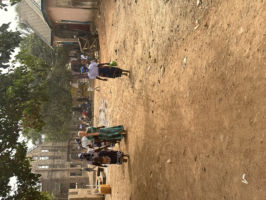 The image depicts an unpaved, reddish-brown dirt road in Akwanga, Nigeria, under daylight conditions. Four women, dressed in traditional attire including skirts, blouses, and head coverings, walk away from the camera in the mid-ground. One woman on the far right carries a green bag. To the left, a multi-story building constructed of grey concrete blocks is under construction, lacking a roof and windows, with visible scaffolding. Adjacent to this, a hand pump water well stands with two yellow plastic jerrycans nearby. In the background, multiple individuals are visible. A group of people gathers near what appears to be market stalls, with at least two motorcycles parked. A small child in a light-colored outfit walks in the mid-background, right of center. On the right side of the frame, a single-story building with a light reddish-brown facade and a green corrugated metal roof is visible. Clothes are hanging on a line outside this building. A wooden cart or structure rests on the ground near the building on the right. Overhead and in the background, green trees are present, and electrical wires are strung across the scene. The ground shows signs of puddles and scattered debris.