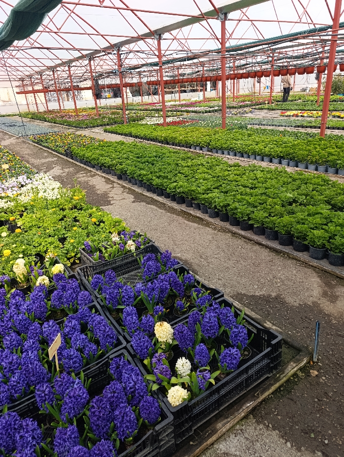 The scene depicts the interior of a commercial greenhouse located in Zimnitsa, Bulgaria. The structure features a red metal frame supporting a translucent roof and partial green netting. In the immediate foreground, multiple black plastic crates contain potted hyacinths; the majority are deep purple, with interspersed white and pale yellow varieties. A narrow, damp concrete or dirt pathway separates these crates from extensive rows of other plants. The midground features parallel rows of lush green potted plants, possibly leafy annuals, followed by numerous beds or pots containing various flowering plants in hues of white, yellow, pink, and red. In the background, a single individual, wearing light-colored clothing, stands upright amidst the plant rows, appearing to observe or attend to the vegetation. Numerous empty brown hanging pots are suspended from the overhead frame throughout the greenhouse.