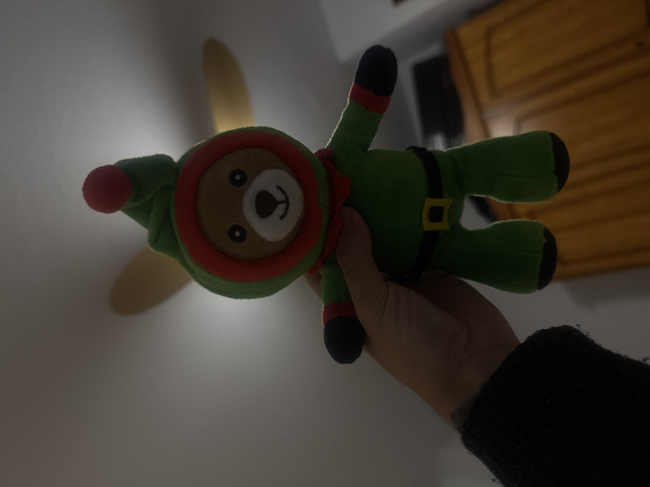 A green, plush bear toy wearing a red and green hat and a black and yellow belt is held by a person. The bear has a brown face and black button eyes. The person's hand and arm are visible, clothed in a black, knit sweater. A partially visible ceiling fan with pale yellow blades is behind the bear's head, and a wooden dresser stands in the background. The image is dimly lit, with a focus on the bear.