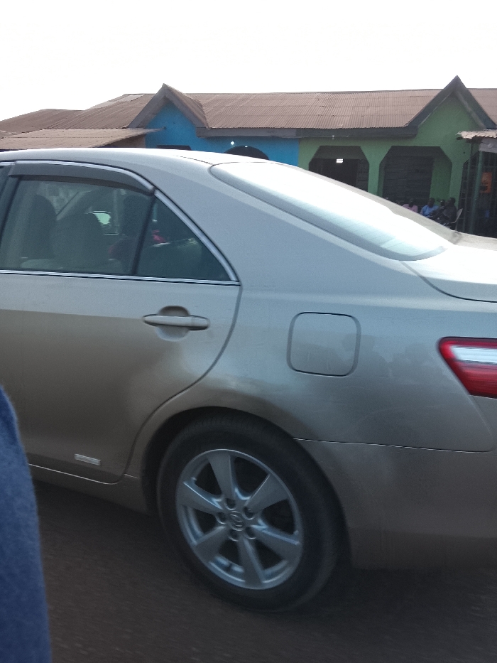 The image depicts a street scene in Wukari, Nigeria. The primary subject is the rear-left quarter of a gold or champagne-colored sedan, identifiable as a Toyota Camry, positioned in the mid-ground. The vehicle features a multi-spoke alloy wheel, a fuel flap on the rear left fender, and the visible edge of the left taillight assembly. The body panel above the rear wheel arch shows a patch of discoloration or dirt. The rear passenger window is tinted, with a dark wind deflector installed above it. A portion of a blue fabric garment is visible in the extreme lower-left foreground. In the background, two single-story buildings with dark brown corrugated metal roofs are visible. The building to the left features a light blue facade with an archway entrance. The building to the right displays a light green facade with at least two archway entrances. Approximately five to seven individuals are indistinctly visible, seated or standing in a shaded area beneath the roofline of the green building. The sky above is clear and bright. The ground surface in the foreground is dark, suggesting pavement or packed earth.