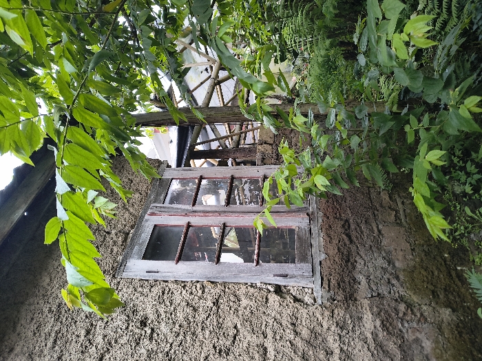 This image, located in An Khe Ward, Vietnam, presents a close-up view of a weathered building exterior partially obscured by dense green vegetation. The left side of the frame features a building wall constructed from a rough, textured material, possibly concrete or stucco, exhibiting a coarse, grey-brown surface with visible weathering and discoloration. Darker patches, indicative of moss or algae growth, are present along the lower section of the wall. A fragment of a dark, corrugated metal roof is visible at the very top edge of the wall. Centered within the left half of the image is a rectangular, double-paneled wooden window. The window frame appears aged, with faded and peeling paint displaying hints of reddish-brown pigment. The glass panes are semi-transparent, reflecting ambient light and obscuring a clear view of the interior, though faint, dark horizontal bars are discernible through the glass. The window appears closed. The right side and foreground of the scene are dominated by lush, green foliage, consisting of various plant species including ferns and leafy shrubs. A prominent branch with bright green leaves extends horizontally across the upper portion of the window. Beyond the immediate vegetation and partially visible through gaps in the foliage and the window's transparency, indistinct structural elements, possibly crude wooden framework or parts of another rudimentary structure, are present in the blurred background. No individuals, explicit actions, or direct interactions are visible within the frame.