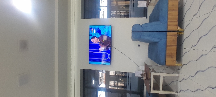 The image depicts an indoor waiting area or lounge in Chinabad, Uzbekistan. A flat-screen television is mounted on a white wall, displaying a light-skinned male figure wearing a dark brown jacket, with his hands raised and clasped in front of him, set against a predominantly blue background with vertical patterns. A power cable extends downwards from the television. Below, two segments of a blue upholstered sofa with light wood bases and gold-colored metal legs are positioned. To the left, a light-framed table with a dark tabletop holds several small dishes or containers and a tissue dispenser. The floor is composed of white tiles patterned with irregular dark blue wavy lines. Large windows with dark frames are visible on either side of the television wall, revealing blurred exterior building structures and ambient light. The white ceiling contains two square recessed fixtures. No individuals are present in the physical space.