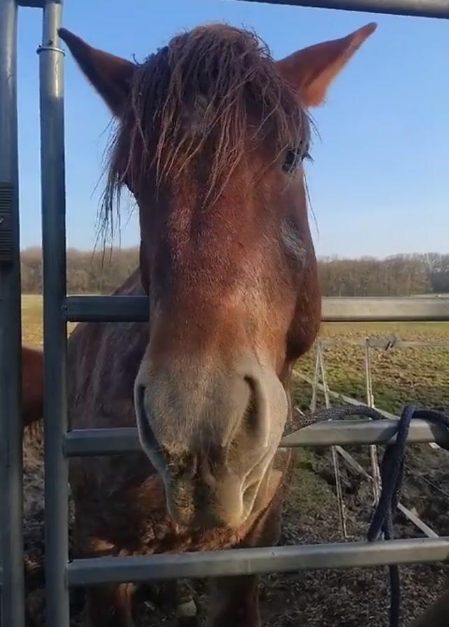 A medium shot reveals a light brown horse standing behind a metal gate, its head slightly protruding between the bars
