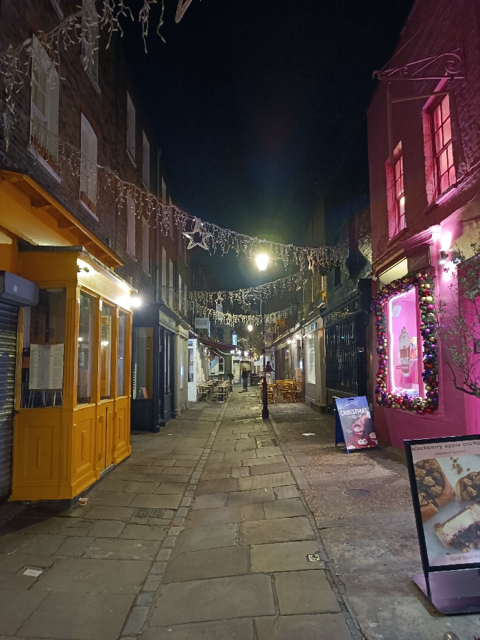 The image depicts D'Arblay Street in Soho, London, United Kingdom, at night. The scene is illuminated by artificial light from street lamps, shop windows, and overhead Christmas decorations. A narrow pedestrian street, paved with flagstones and interspersed cobbles, recedes into the distance. Buildings of various architectural styles and colors line both sides. Overhead, multiple strings of white LED icicle lights and larger white star-shaped decorations are suspended across the street. On the left side, a multi-story brick building houses commercial establishments on the ground floor. In the foreground, a shop with a bright yellow-orange wooden facade features large glass display panels and an orange awning partially showing "THE BREAKFAST CLUB" signage. A white menu board near its entrance also displays "BREAKFAST CLUB." Further down, other shops with various facades are visible, some with closed metal shutters. Several outdoor seating arrangements, consisting of metal tables and chairs, are visible along this side. On the right side, a prominent multi-story building features a distinct bright pink painted brick facade. Its ground floor showcases a brightly lit display window heavily framed with colorful Christmas baubles (red, green, gold, purple), illuminating a dessert-like product inside. An A-frame sign with "CHRISTMAS" and "wobble-free pudding" text is positioned near this window. Closer to the foreground, another A-frame sign displays an image of "blackberry apple crumble." Further along this side, more shops and outdoor seating areas with wooden tables and chairs are visible. A traditional-style black street lamp stands in the mid-ground, casting light onto the street. Two individuals are present in the mid-ground: one person stands near the center-left facing away, and another is partially visible further down the street on the right. The sky overhead is dark.