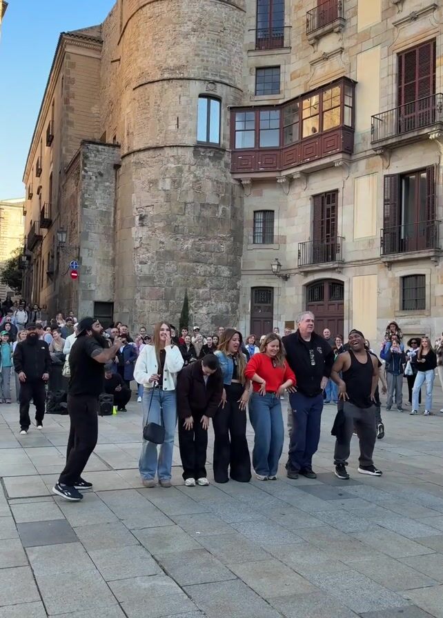 The video captures a group of people participating in what appears to be a Macarena dance performance in a European city square. The square is surrounded by old stone buildings with windows and balconies, suggesting a historic district. In the foreground, a line of approximately seven individuals stands with two men in black instructing and leading them. These men are energetic and animate the group. The participants include both men and women of varying ages and ethnicities, dressed in casual clothes like jeans, sweaters, and t-shirts. Behind this group, a crowd of onlookers watches and records the performance with their phones, indicating the event is either spontaneous or a planned public performance. The ground is paved with large, flat stones. The overall atmosphere is lively and cheerful, with people smiling and laughing. The video is taken during the day with clear lighting, showcasing the architectural detail of the surrounding buildings.