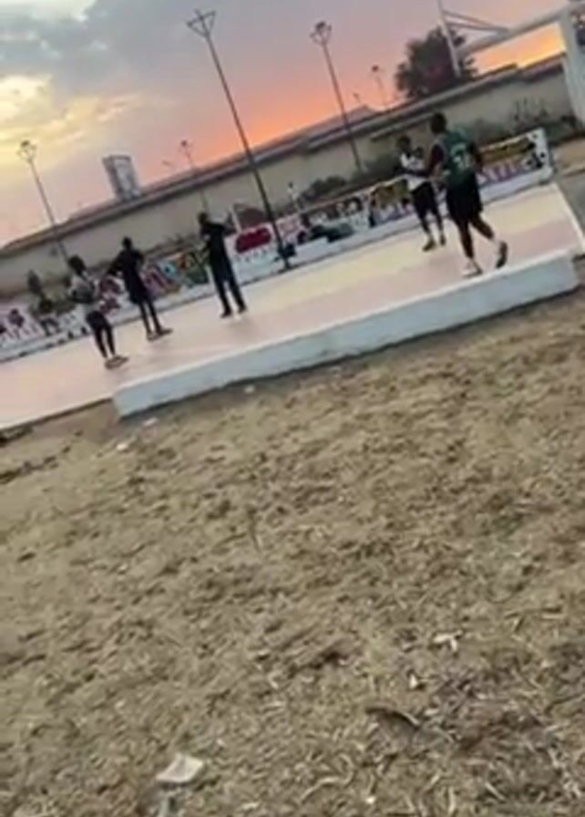 n outdoor basketball court with several individuals participating in a game. The court is painted with light and dark colors, and there are multiple light posts surrounding it. A fence runs along the back of the court, adorned with graffiti. Spectators are visible near the court's perimeter. The foreground is dominated by dry, patchy grass, with some litter scattered around. The sky in the background shows the colors of a sunset.