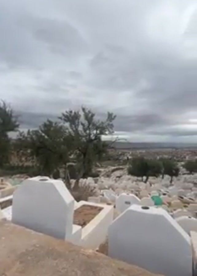The camera looks out over a large cemetery filled with white, rectangular grave markers, interspersed with a few trees. Beyond the cemetery, the land slopes down to a town in the distance under a cloudy sky. The camera slowly pans from left to right. A black bucket with white contents is partially visible in the lower left corner of the frame.