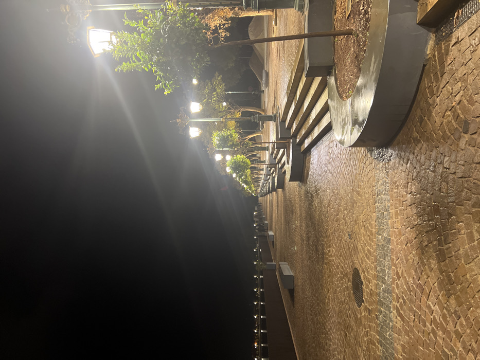 An illuminated outdoor path stretches into the night. Ornate lampposts line the walkway, each adorned with small trees. Stone pavers form the pathway, glistening as if wet. Raised planters with small trees and seating intermittently punctuate the design. A series of stairs with planters ascend at intervals, adding verticality to the scene. The darkness on the left side contrasts sharply with the bright path.