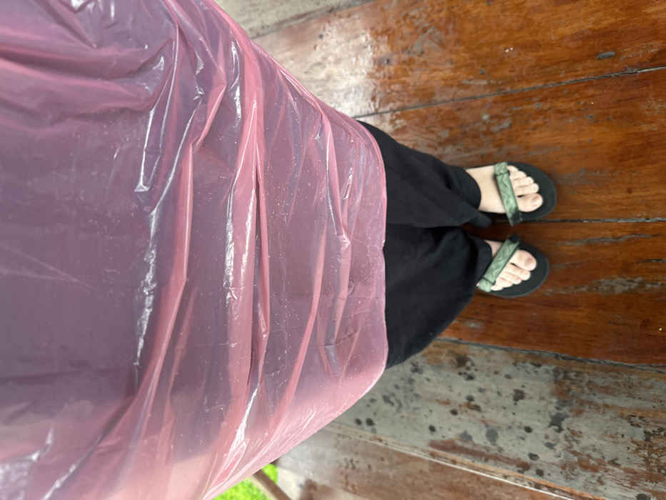 An overhead photograph depicts the lower body of an individual standing on a wet wooden plank surface in Ban Paem Bok, Thailand. The person is wearing a translucent pink plastic poncho, the lower edge of which is visible, covering the upper portion of black trousers. The individual's feet are clad in black sandals with green patterned straps, exposing bare toes. The wooden floor exhibits a glossy, wet appearance with numerous small water droplets visible on its surface and on the pink poncho. A blurred hint of green vegetation is visible to the far left.