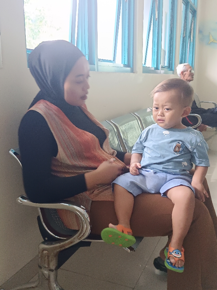 The image displays an indoor waiting area in the city of Margorejo, Indonesia. An adult woman, wearing a black hijab, a black long-sleeved top, and a reddish-orange horizontally striped sleeveless vest, is seated on a metallic waiting chair with a chrome frame and perforated backrest. She is positioned slightly right of center, her right hand resting on the lap of a toddler seated on her legs. The toddler, approximately 1-2 years old, has light brown hair and wears a light blue t-shirt with cloud motifs and an animal graphic, light blue shorts, and mismatched brightly colored sandals (green sole/orange strap on the left foot, blue sole/orange shark strap on the right foot). The toddler faces slightly left with a neutral expression. In the background, to the right, an elderly man wearing glasses and a light-colored shirt is partially visible, seated on an identical metallic chair and looking towards the right. Between the woman and the elderly man, two unoccupied metallic waiting chairs are visible. The background wall is light beige and features two large windows with light blue frames, admitting natural light. A light blue and yellow stylized bird or wing decal is present on the wall above the elderly man. The floor is a light grey or off-white tile.