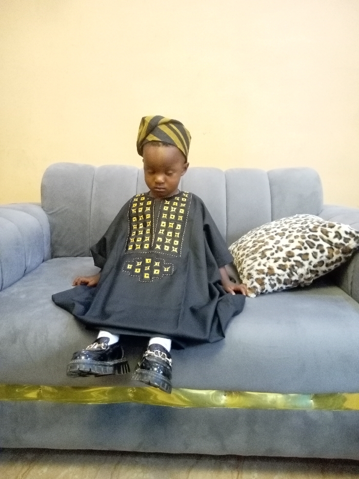 A young child is seated centrally on a gray upholstered sofa in an interior room in Igbenu, Nigeria