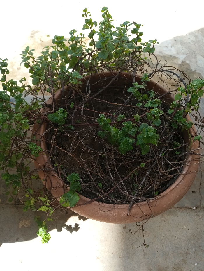 The scene, located in Maiburiji, Nigeria, displays a single terracotta-colored, circular plant pot positioned on a light-colored concrete surface. The pot contains dark brown soil from which a plant, consistent with a variety like mint, is growing. The plant exhibits both active and senescent growth: numerous small, bright green leaves are visible, primarily clustered on the upper and outer portions of thin, branching stems. The central area within the pot is densely filled with a network of thin, dried, dark brown, bare stems. Direct sunlight casts distinct shadows onto the concrete surface to the right and bottom of the pot. No individuals, actions, or interactions are present in the image.