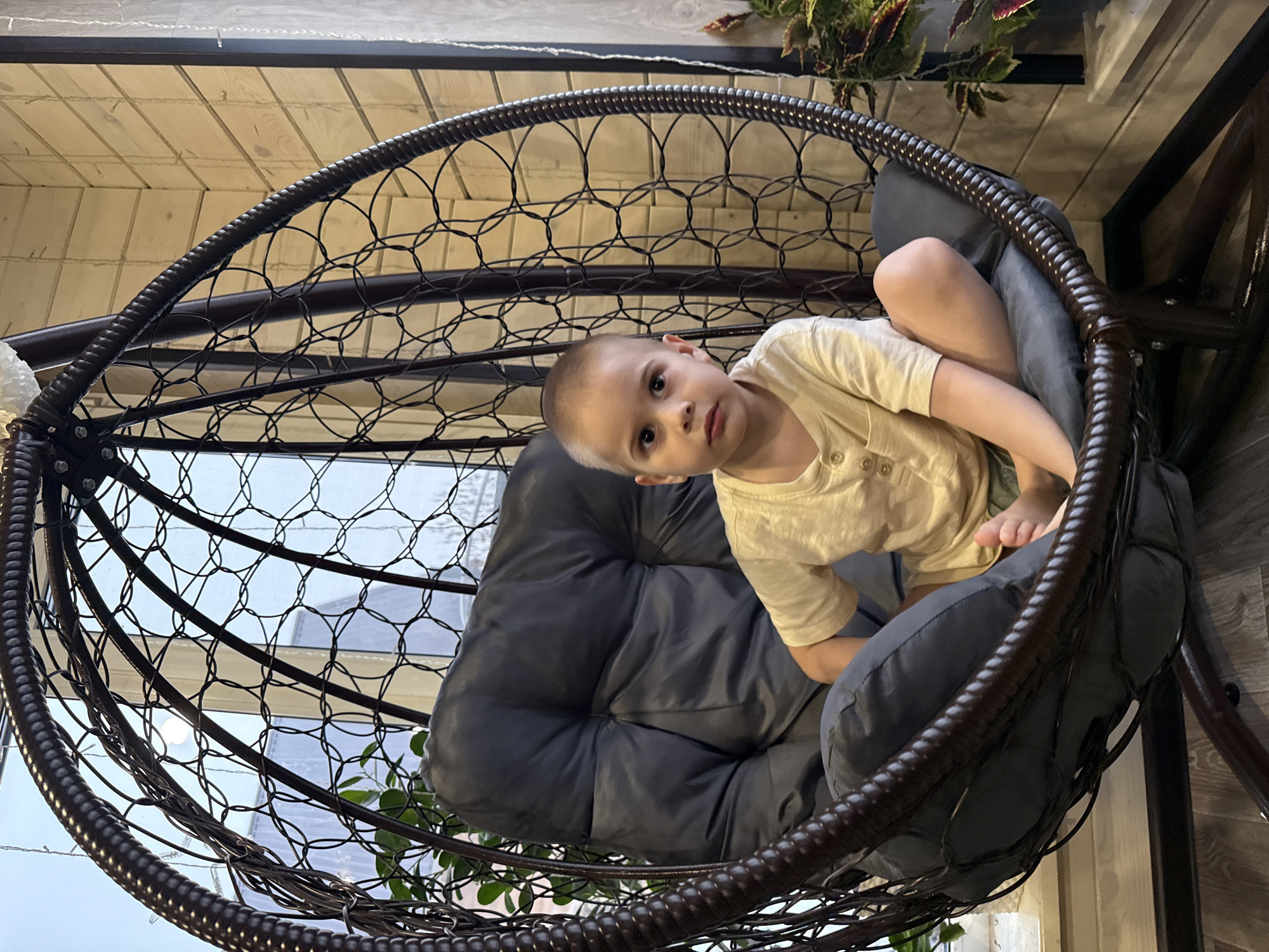 A young child is seated in a brown, egg-shaped hanging chair with gray cushions. The chair appears to be located indoors, near a window with visible outside scenery. Plants are placed near the chair. This photo was taken in Chaikovsky, Russia.