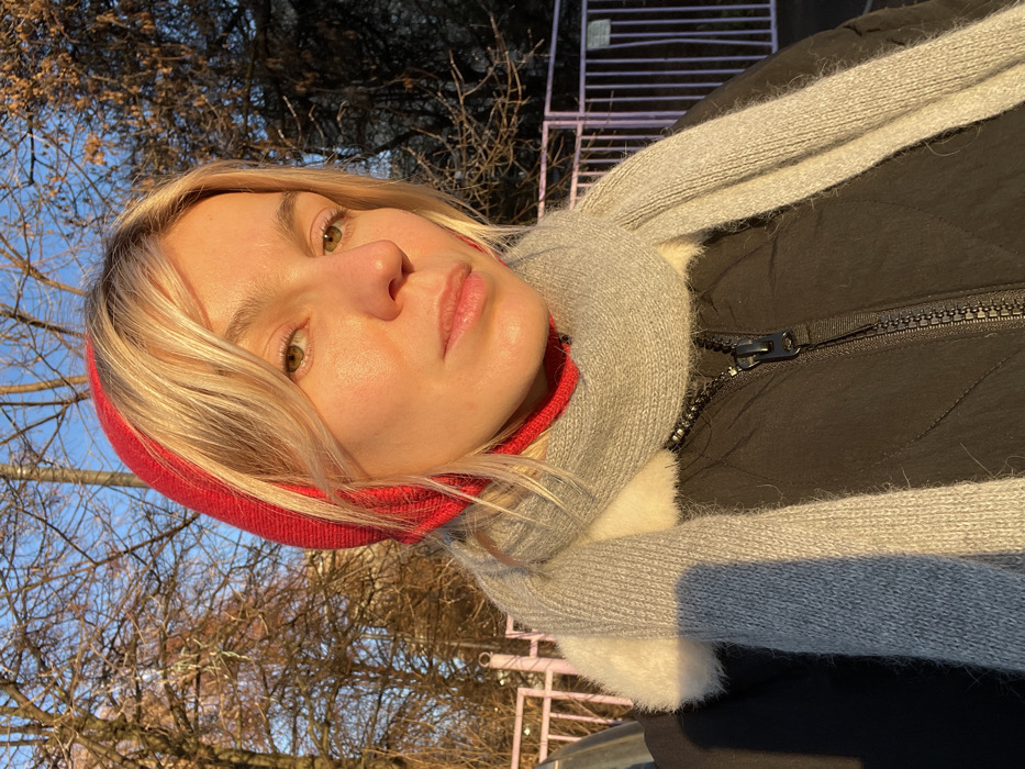 A woman in a black jacket with a gray scarf, wearing a red headband, is oriented sideways to the camera. She has fair skin, light blonde hair, and light-colored eyes. The sunlight shines directly on her face. Bare tree branches and a section of pink metal structure are visible in the background. The jacket is zipped up.