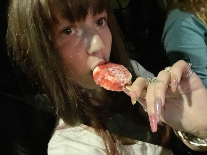 A person with long brown hair and bangs is eating a red and white popsicle. They have numerous rings on their fingers and long, decorated nails. They are wearing a white shirt and what appears to be a seatbelt. The background is dark, suggesting the photo was taken in a car at night. Another person, wearing a teal shirt, is partially visible in the background.