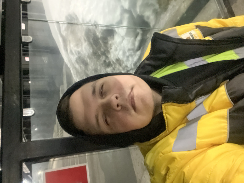 A male individual is depicted in a close-up, selfie-style photograph taken in the city of Ромашка Нп, Russia. He is positioned inside what appears to be a glass-paneled shelter or enclosure during nighttime or low-light conditions. The subject, a Caucasian male with dark hair, wears a black hooded sweatshirt under a yellow and black insulated jacket, which features horizontal grey reflective strips across the chest. A lime-green reflective vest is visible beneath the main jacket. His eyes are partially closed, and his expression is neutral. Behind the subject, to his left through the glass, a red rectangular object is partially visible. To his right, through another glass panel, a large mound of accumulated snow is present, indicating a cold, outdoor environment. The snow is illuminated by artificial light sources, causing reflections on the glass structure.