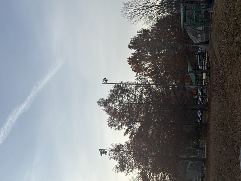 The landscape features a light, cloudy sky with a contrail. In the foreground, tall trees with brown foliage line the horizon. Three tall poles with lights are interspersed among the trees. A grassy area extends to the lower edge of the image. In the background, there are small covered structures, possibly picnic shelters or seating areas.