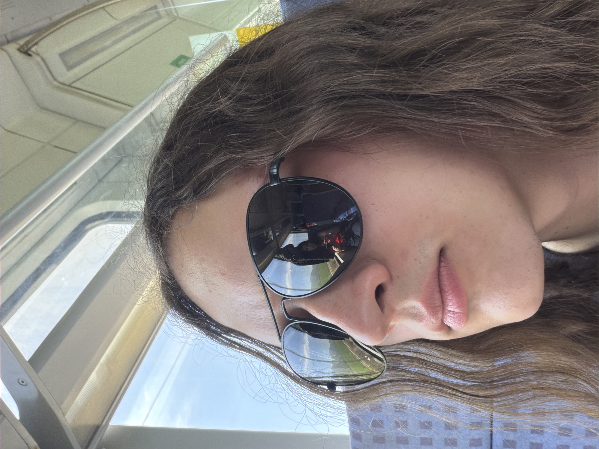 A close-up, tilted portrait shows a person with light skin and brown hair, wearing aviator-style sunglasses