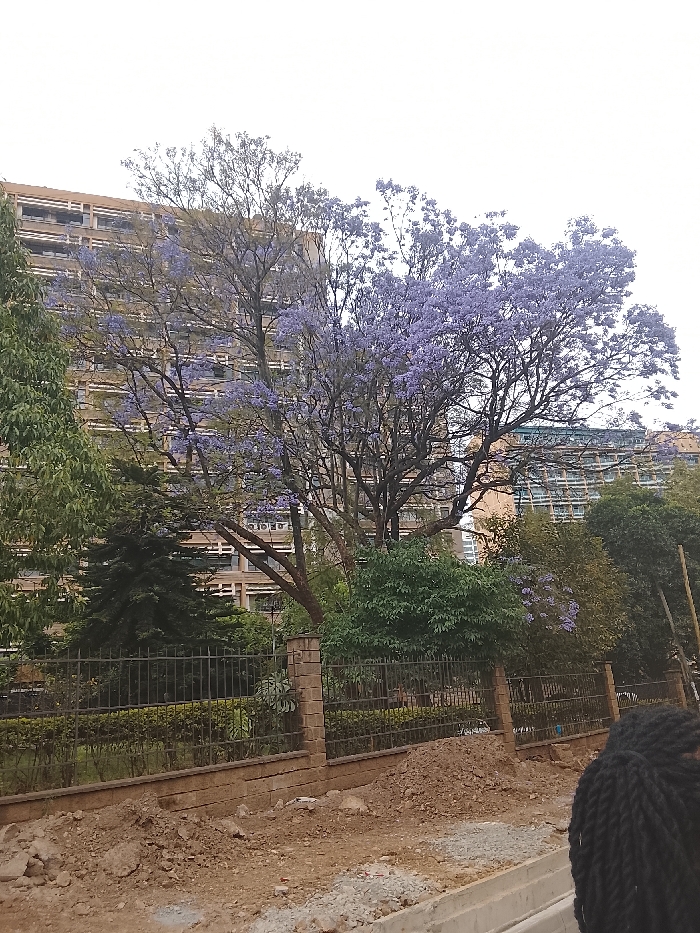 The image displays an outdoor urban scene in Kiambu Township ward, Kenya, under an overcast sky. In the immediate foreground, the top of a person's head with dark braided hair is partially visible on the bottom right. The ground surface in the foreground consists of loose, light brown soil mixed with gravel, bordered by a concrete curb along the bottom edge. A dark metal fence with vertical pickets and horizontal rails, supported by light brown brick-like pillars, spans the midground, separating the foreground from a landscaped area. Behind this fence, a strip of maintained green foliage, possibly a hedge, is visible. Dominating the central midground is a large tree with widespread branches covered in numerous purple/lavender blossoms, consistent with a flowering Jacaranda tree. To the left of this tree, a tall, dense evergreen tree stands, and further green foliage appears on the right. In the background, two multi-story buildings are visible above the tree line. The building on the left is a light-colored high-rise with multiple floors featuring balconies or windows. A second, partially obscured building with a similar architectural style is present on the right. The sky is a uniform, bright white, indicating overcast weather conditions. No specific actions or interactions are depicted.