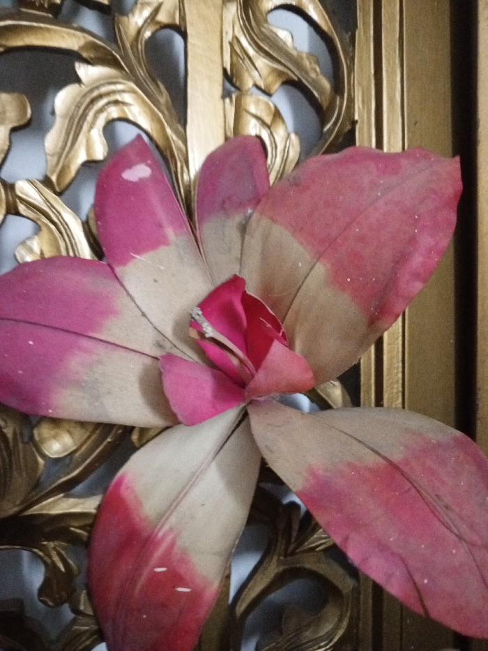 The image presents a close-up view of an artificial flower, centrally positioned. The flower is composed of multiple broad petals, each displaying a bicolored gradient from magenta-pink at the outer edges to a lighter beige or pale tan towards the center. Fine linear patterns, resembling veins, are visible on the petal surfaces, along with scattered small white particulate matter. The flower's core consists of tightly folded, intensely pink fabric elements, from which a single, slender, light-colored stamen-like structure extends upward. The background features an ornate, golden decorative panel with intricate, curvilinear relief carvings. A vertical golden frame element is visible along the right edge of the image. Through the gaps in the golden panel, a muted light grey or off-white surface is discernible. No individuals or specific actions are depicted. The visual evidence does not contain information to ascertain the specific location within the city of Phakeo, Laos.