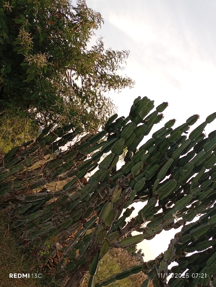 A cluster of green cacti dominates the foreground, their segmented arms branching out in a seemingly chaotic yet structured manner. Sunlight filters through gaps in the cacti, illuminating glimpses of dry grass below. In the upper left, a tree with pale, delicate flowers complements the cacti. The sky, barely visible, suggests early morning or late afternoon light. The lower left and right corners display device information including "REDMI 13C" and the date "11/12/2025 07:21".