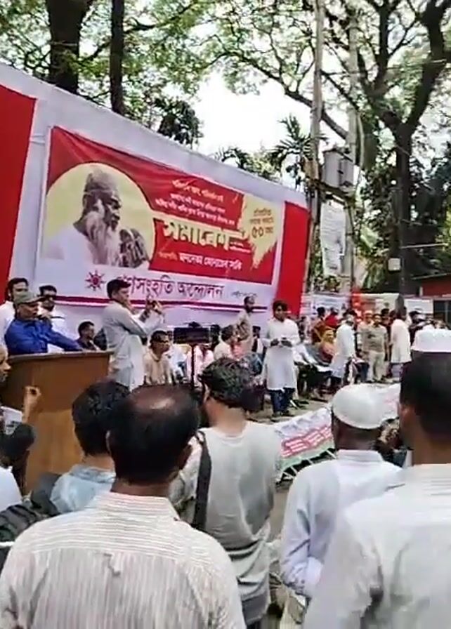 This video shows a crowd of people gathered in an outdoor setting. The crowd is dense, with individuals standing and sitting closely together. Many people are wearing white clothing, and some are wearing traditional head coverings. In the foreground, some individuals are holding up their phones to record the scene. A man is speaking into a microphone from a podium in front of a large banner. The banner features an image of a man with a beard and text written in Bangla script. The background includes trees and a building. Overhead, a large concrete structure, possibly a bridge or overpass, is visible. The overall atmosphere suggests a political rally or public gathering.