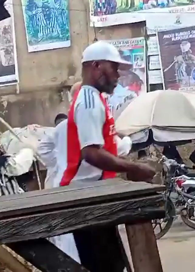 crowded street scene in what appears to be a market or public area in Africa. Many people are walking around, including men, women, and children. People are wearing a variety of clothing. There are several wooden tables or structures in the foreground. In the background, there's a building with posters on it. There's also a parked motorcycle and some umbrellas providing shade. People are passing by. The atmosphere seems lively and busy.
