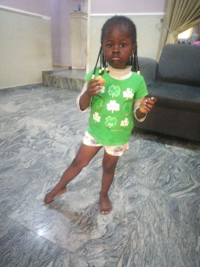 An image captured indoors depicts a young child of dark complexion, standing barefoot on a polished gray and white marbled tile floor. The child has numerous small, dark braids adorned with light-colored beads (beige, brown, white) on several strands. She is dressed in a light-colored, long-sleeved undershirt, topped with a short-sleeved bright green t-shirt featuring multiple white and green four-leaf clover graphics. She wears light-colored shorts with a faint, repeating pattern. In her left hand, the child holds a small, round, light-brown object, consistent with a baked good. Her right hand is open, with fingers slightly curled. The child faces the camera with a neutral expression. The background on the left shows light-colored walls, a tiled step, and a section of a light purple wall with a pale pillar. To the right, a dark gray upholstered sofa or armchair is partially visible. The exact city and country of the location are not discernible from the image.