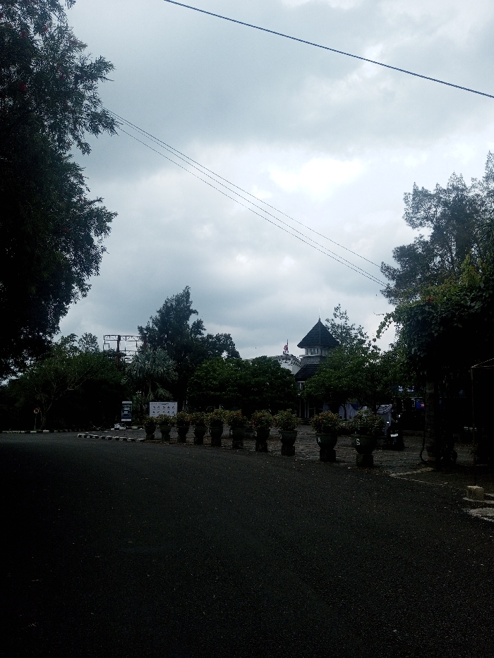 The image presents an outdoor scene in Kalchini, India, under an overcast sky. A dark asphalt road dominates the foreground, curving slightly to the left where a curb with black and white striped markings is visible. A linear arrangement of approximately ten dark, urn-shaped planters, each containing green plants and marked with a white "S," delineates the right edge of the road, bordering an unpaved area. In the mid-ground, dense green foliage from various trees and bushes obscures much of the background. Above the tree line on the left, a large, empty metal framework, characteristic of a billboard structure, is visible. Towards the center-right, a building with a distinctive dark, peaked roof and a white facade is partially discernible amidst the trees. A flagpole extending from this building displays a red and white flag. Faint forms of parked vehicles, likely motorcycles, are present in the unpaved area behind the potted plants on the right. Multiple power lines or communication cables traverse the upper portion of the frame horizontally against the uniformly cloudy sky. No clearly identifiable individuals are present within the scene.