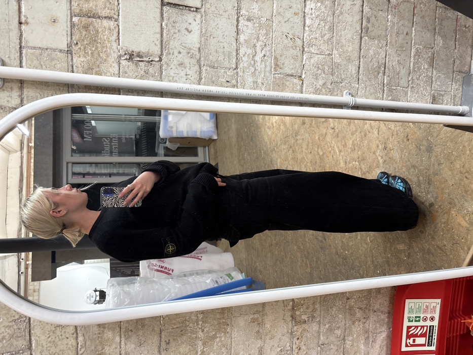 An interior scene captured through a full-length, white-framed mirror depicts an individual in right profile. The person has blonde hair styled in a low ponytail and is wearing a black crew-neck sweater featuring a circular Stone Island compass logo patch on the left arm. They are also wearing black wide-leg trousers and blue-patterned clogs or similar footwear. The individual holds a smartphone, equipped with a black and white zebra-patterned case, in their right hand, appearing to take a mirror selfie. Their left hand is placed within their trousers pocket. The mirror's reflection reveals a commercial or studio environment. Visible elements include a dark structural pillar, glass doors or windows displaying reversed text, clearly legible as "100 FM STUDIO". This indicates the location is within or associated with "Unity Radio 100FM Studio" in Manchester, United Kingdom, likely situated in the Northern Quarter area. Beyond the mirror's frame, on the left, a red fire extinguisher box labeled "CARBON DIOXIDE" is partially visible. On the right, a rugged wall of light-colored stone or brick features a vertically mounted white PVC pipe, which bears manufacturing text including "SHRIPLEITEK (EURO CELL) BCA Made in PRC 13/11/24" and "4000N -PVC/LDPE 20M". The floor throughout the visible area is a light-colored, industrial concrete or similar material. The background within the reflection shows stacks of plastic-wrapped items, some with partially visible red lettering.