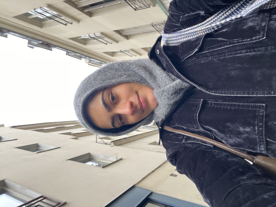 A young adult female is depicted in a close-up, upward-angled selfie, standing on a narrow street in Paris, France. She has a medium complexion and dark hair, visible around her face. Her head and neck are covered by a grey, knitted hood or balaclava. She is wearing a dark, possibly velvet or corduroy, utility-style jacket featuring prominent stitching and four flap pockets on the front. A brown leather strap from a shoulder bag is visible over her left shoulder, and a blue, white, and brown/green patterned woven tote bag strap is visible over her right shoulder. She is looking directly at the camera with a slight smile. The background consists of multi-story, light-colored Haussmannian-style buildings characteristic of Parisian architecture, with tall, narrow windows, some equipped with small, dark metal railings. A dark blue architectural element, likely an awning or sign, is partially visible on the ground floor of the building to the left. The sky is overcast and bright white.
