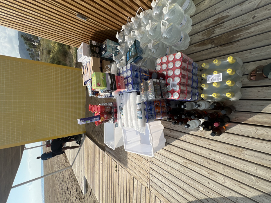 The image depicts an extensive array of beverages and supplies arranged on a wooden boardwalk adjacent to a sandy beach in Castelldefels, Spain