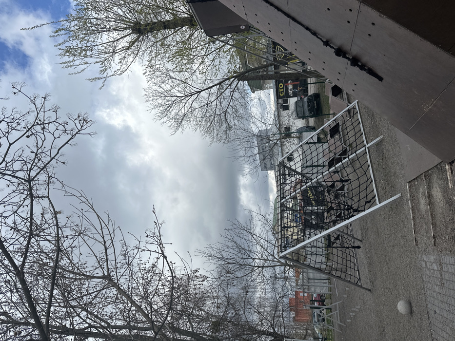 playground in Kriukivshchyna, Ukraine (latitude: 50.37, longitude: 30.375). In the foreground, there is a climbing frame constructed of metal and black netting. The frame is positioned on a gravel surface. In the background, there is a brown climbing wall with a black rope. To the left, there are bare trees. Behind the climbing frame, there is a building and a sign that reads "СТО". A white van is parked nearby. The sky is overcast with white clouds. There is a white ball on the ground. The scene is empty of people.