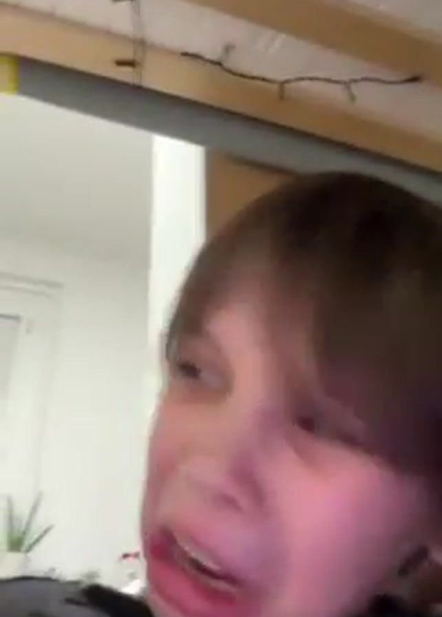 A young boy is looking directly at the camera, crying and visibly upset