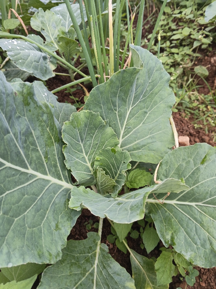 The scene depicts a close-up view of cultivated plants in Makilala, Philippines. In the foreground and center, a young Brassica plant, likely cabbage or broccoli, exhibits several large, broad, dark green leaves with distinct venation. A central, tightly furled bud is visible. Small water droplets are present on the surface of some leaves. Behind and to the left of the central plant, multiple tall, slender green stalks, consistent with green onions or chives, grow vertically. Other broad-leafed plants, similar to the main subject, are partially visible in the mid-ground. The plants are rooted in dark brown soil, with some smaller green weeds scattered throughout the immediate environment. No human figures or active interactions are observed.