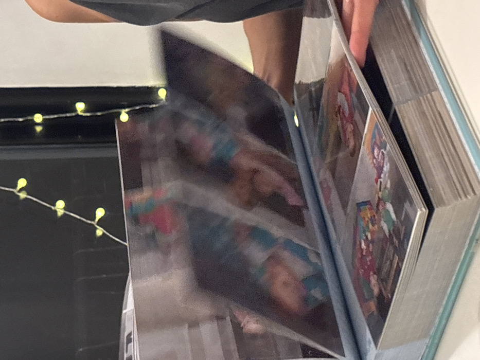 A person flips through a photo album with a glossy cover. The album is thick, filled with pages of pictures. One visible spread shows a photo partially obscured by motion blur. String lights with round bulbs hang near the album's edge. The album sits on a white surface. The person's arm and hand are visible as they turn the page.