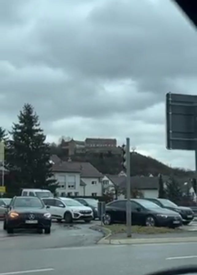 view from inside a vehicle at an intersection on a cloudy day. In the distance on a hill sits a castle or fortress. There are multiple cars visible in the foreground, waiting at a traffic light. The camera is static, capturing the scene through the vehicle's window. The environment appears to be a town or residential area with houses interspersed with trees. The overall tone is neutral and documentary-like, simply recording the scene as it unfolds.