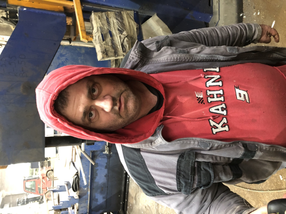 A male individual is depicted from the chest up in an industrial or workshop environment located in the city of Čeluga, Montenegro