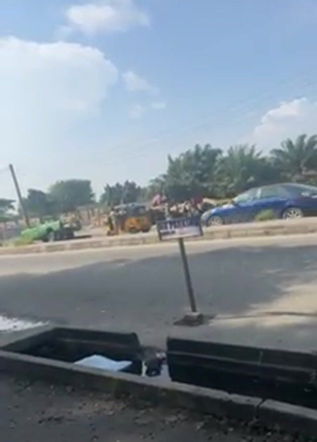 n outdoor scene with a view of a road and a dirt path. On the road, there are a few vehicles including a yellow three-wheeled taxi, a green truck, a dark-colored car, and a yellow pickup truck. There are some people visible on the road and nearby. A "NO PARKING" sign is posted on the side of the road. The dirt path is dirty and uneven, with some water puddles. One or two people are walking on the path, each pulling a cart filled with stacked merchandise. There is a tree and some buildings visible in the background. The sky is partly cloudy.