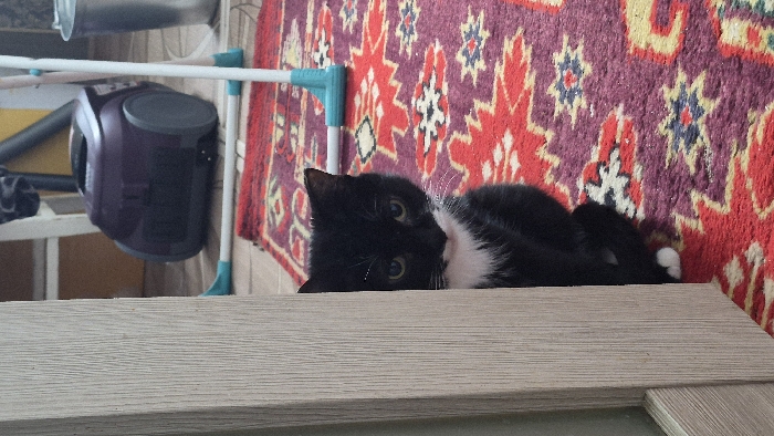 An indoor scene in the city of Kamennyi Kliuch, Russia, depicts a black cat with a white chest and white paws peeking from behind a light-colored wooden doorframe or wall edge on the left. The cat's head is tilted slightly, and its eyes are directed towards the viewer. The floor is covered by a patterned rug featuring red, purple, yellow, and blue geometric designs. In the background, to the right of the cat, a purple canister vacuum cleaner with grey wheels is visible on a light-colored floor, positioned near the edge of the rug. A light-colored cleaning tool handle with teal plastic components lies partially on the rug and partially on the floor. Further to the right, a metallic bucket or container is present.