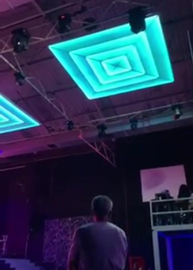 The camera pans across a large venue space, revealing a modern stage setup with neon lighting in geometric shapes. A man wearing a gray shirt walks towards the stage, which is decorated with various colorful neon structures. Above, the ceiling features square-shaped light fixtures emitting a bright blue glow. The overall atmosphere is dimly lit with a purple hue.